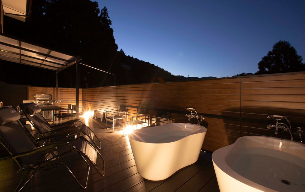 天然温泉をお楽しみいただける内風呂と露天風呂。 内風呂はゆったりお入りいただける広さの石造りの浴槽、景色をお楽しみいただける大きな窓を開けていただくと、半露天のように外の空気を感じてい ただけます。 また、ウッドデッキにはスタイリッシュな露天風呂の浴槽が2基。お好きな時間にお好きなだけ、温泉をお楽しみください。